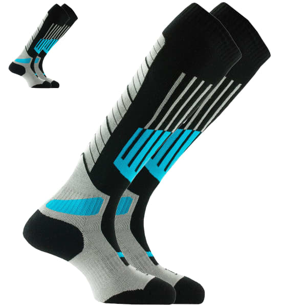 Verkauft in Sets von 2 Paaren, Die MI BAS SKI ALL MOUNTAIN X2 von Thyo bieten eine interessante Alternative zu klassischen Skisocken, indem sie unter anderem einen Aufprallschutz und eine optimierte Wärmekonstruktion integrieren.